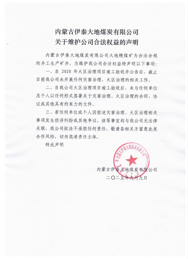 内蒙古伊泰大地煤炭有限公司 关于维护公司合法权益的声明 <span>发布时间:2025-09-09</span> | <span class="views">关注:<b id="viewCountId">122</b></span> | <a href="javascript:void(0)" class="print"><i class="ion"></i></a> 返回列表 上一条 下一条